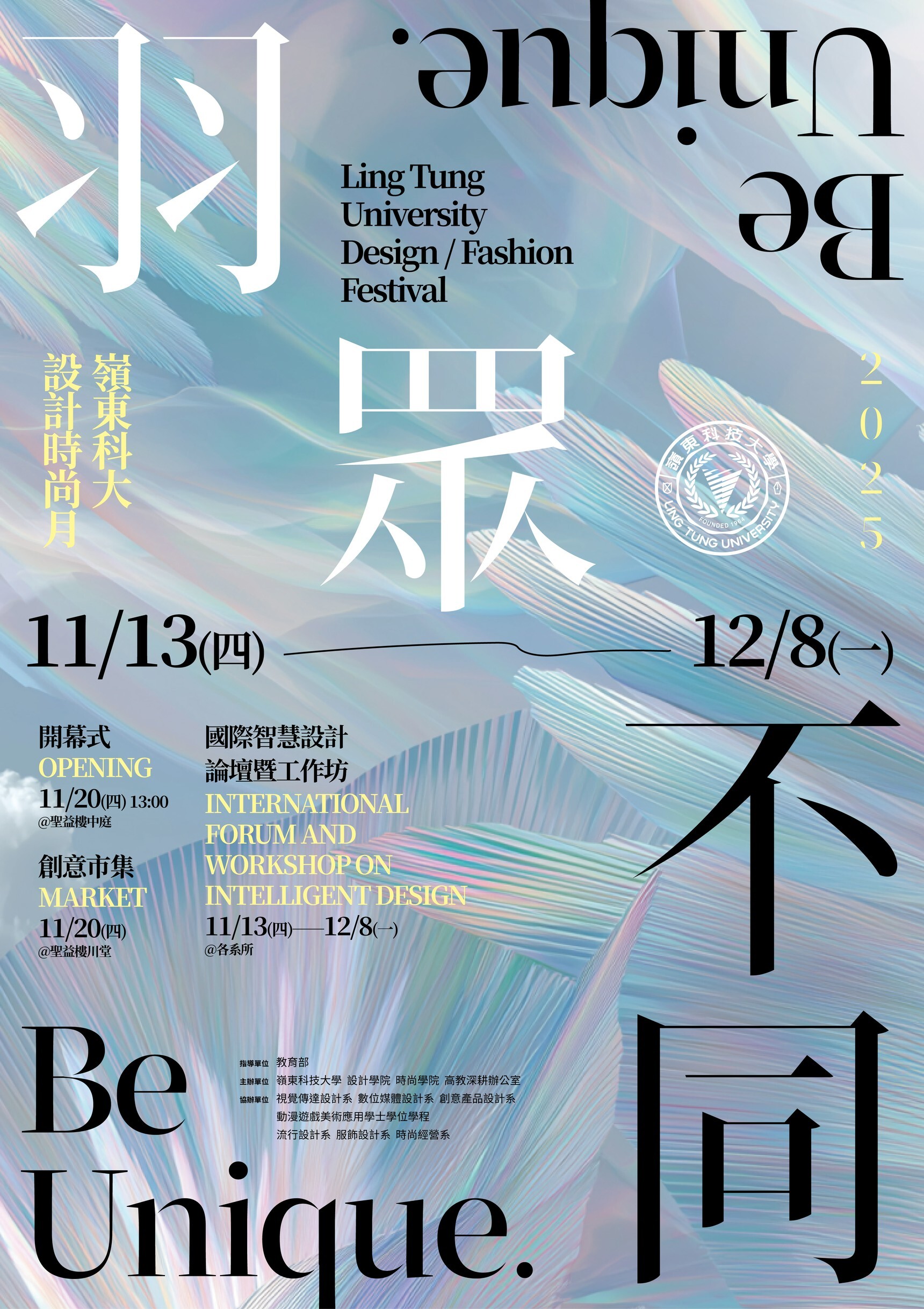 2025 年嶺東科技大學設計與時尚學院年度盛事 「嶺東設計時尚月」 以 「羽眾不同」 為主題盛大啟動,象徵創意的誕生與飛翔。設計的起點如同羽翼的生成,從靈感的一筆孕育無限可能;羽的結構象徵設計對比例與平衡的思考;羽的光澤如創意閃爍的瞬間,映照情感與美感的流動;當作品完成蛻變,設計如羽翼展開,自由翱翔於未知的天空。本次活動展現嶺東設計時尚教育的多元想像與創意能量,邀請您一同見證靈感長出翅膀的時刻。
